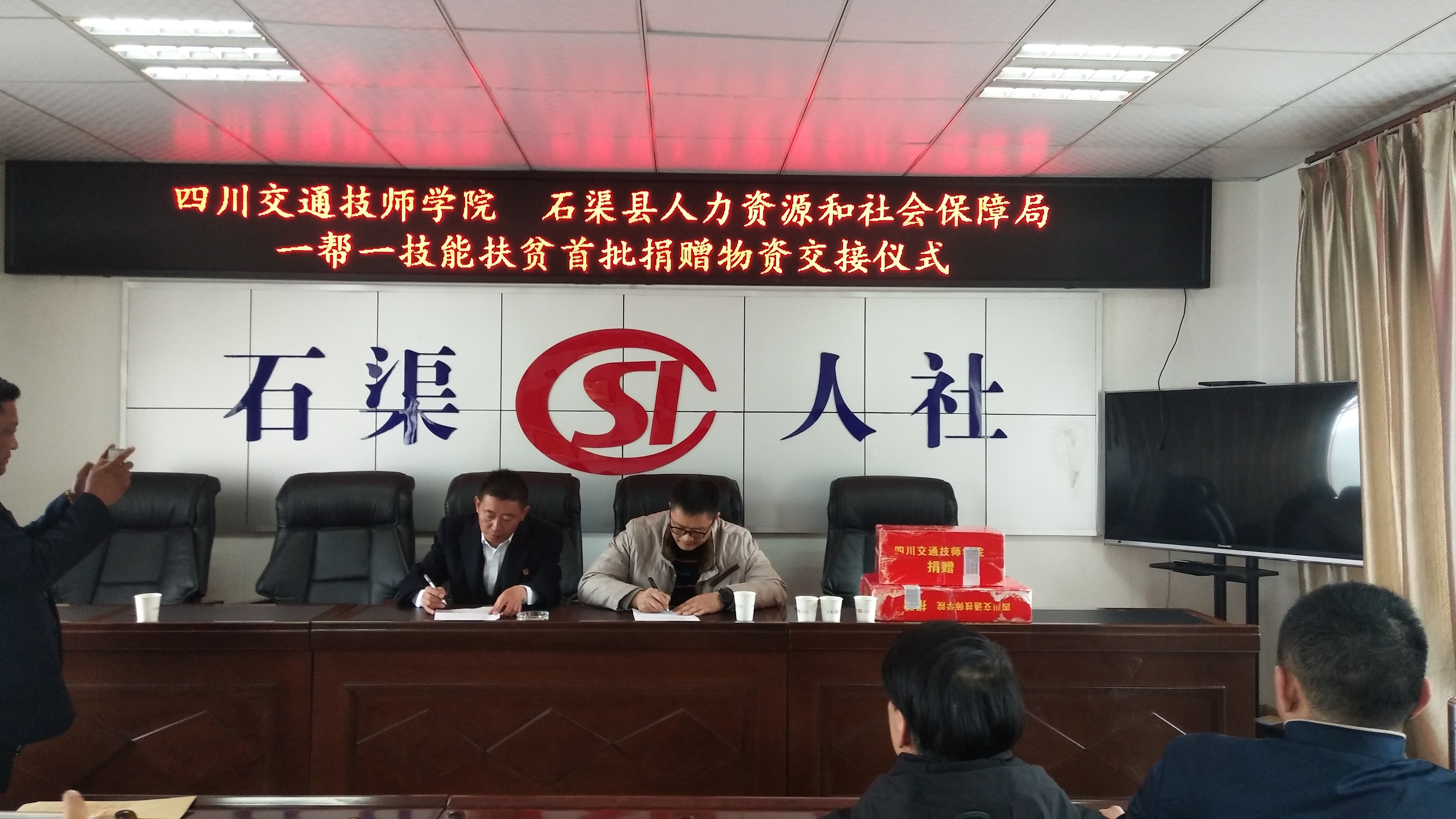 招聘会结束后,学院向石渠县人社局捐赠了首批用于共建摩托车维修培训基地的物资。双方约定,摩托车维修培训基地选址确定后,学院安排专业教师负责维修培训基地的环境设计,同时捐赠第二批物资。
