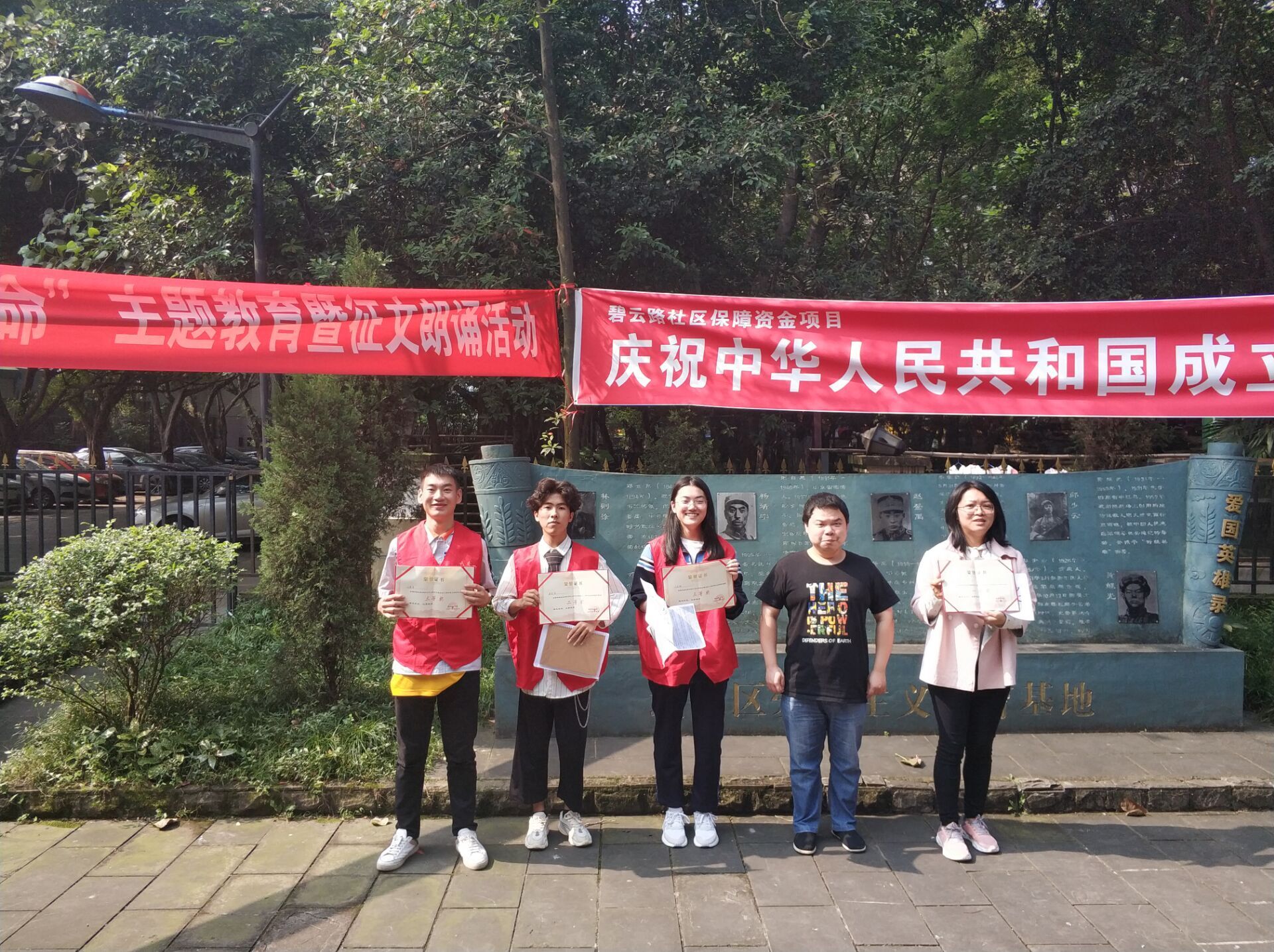今天我校道桥系的青年志愿者们去武侯区李家钰将军墓碑参加志愿活动,青年志愿者穿着统一的红色志愿服,整齐划一。演奏国歌,献上了花篮,对革命烈士进行了默哀,集体歌唱“我和我的祖国”。参加了社区组织的中、小学及各社区青年志愿者和社区各单位一同庆祝“中华人民共和国七十周年”的征文演讲比赛,在这次演讲中获得一个二等奖,两个三等奖,三个奖项,最后我校志愿者集体拍照留念。