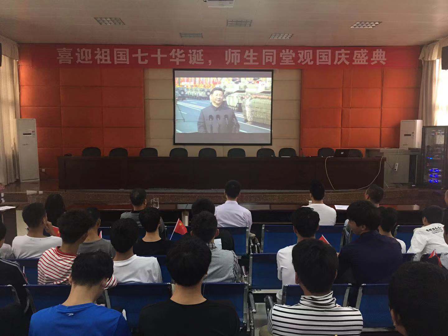 10月1日,学校分校区组织国庆假期留校学生,集中收看“庆祝中华人民共和国成立70周年大会”直播,师生警民共聚一堂喜迎中华人民共和国70华诞。