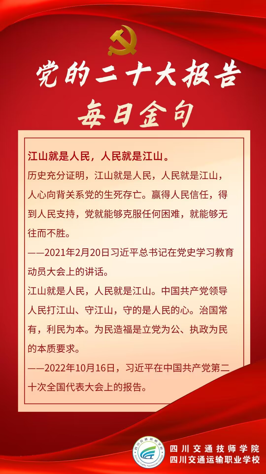 为深入贯彻学习党的二十大精神,学校采用“微学习”方式,通过多种新媒体平台推送《党的二十大报告每日金句》学习卡片,不断营造良好学习宣传氛围,引导广大师生坚定理想信念,凝聚奋进力量,践行初心使命,厚植爱党、爱国、爱校情怀。