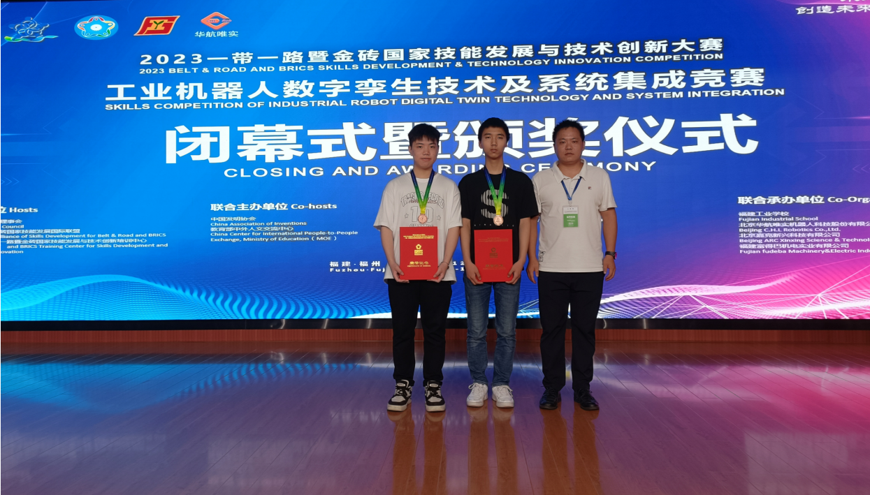 2023一带一路暨金砖国家技能发展与技术创新大赛—工业机器人数字孪生技术及系统集成竞赛(中职组中国区决赛)在福建工业学校成功举办。本次大赛共有来自全国中职院校的66支代表队参赛,历经2天激烈角逐,我校机电工程系曹虎、喻航两位同学组成的参赛队伍获得三等奖。