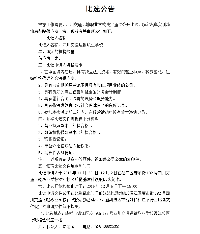 四川交通运输职业学校汽车实训烤漆房装配项目比选公告-四川交通运输职业学校-官方网站