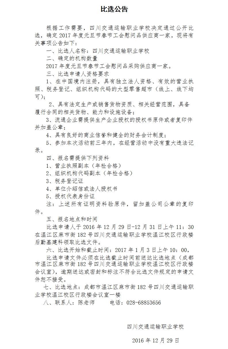 四川交通运输职业学校工会慰问品采购供应商比选公告-四川交通运输职业学校-官方网站
